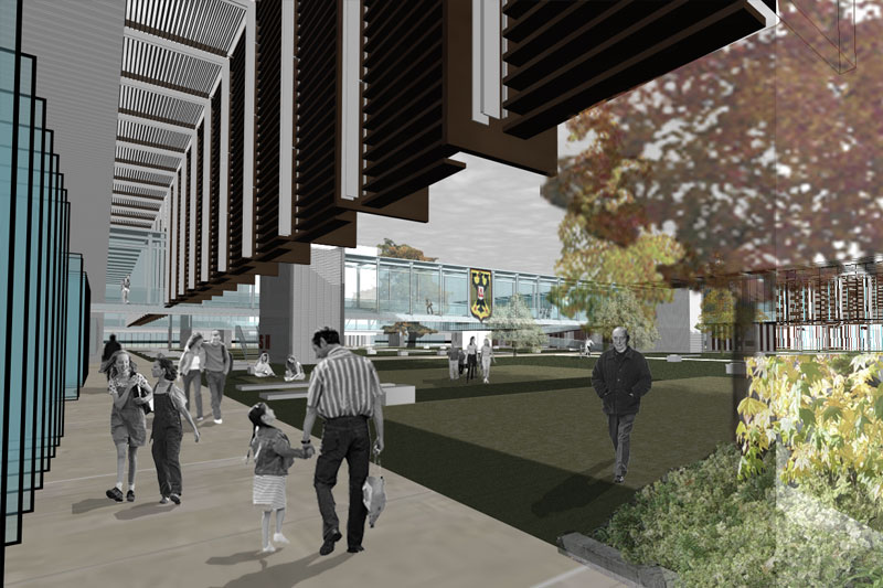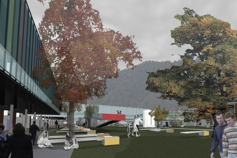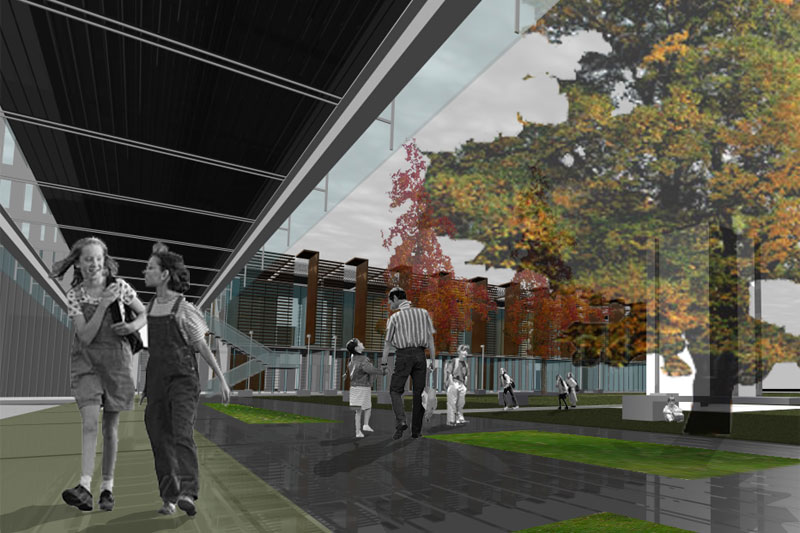 El proyecto hace un primer gesto de trazado estableciendo dos ejes perpendiculares que evocan la filosofía verbita. Un eje comunitario en sentido norte-sur y un eje educativo en sentido oriente-poniente. La intersección de estos ejes da origen a la Iglesia, elemento fundacional y omnipresente que recibe y articula los ingresos. Se crea un atrio semi-público, que se abre a la vez al barrio y al colegio, reforzando la misión evangeli­zadora de la congregación.
