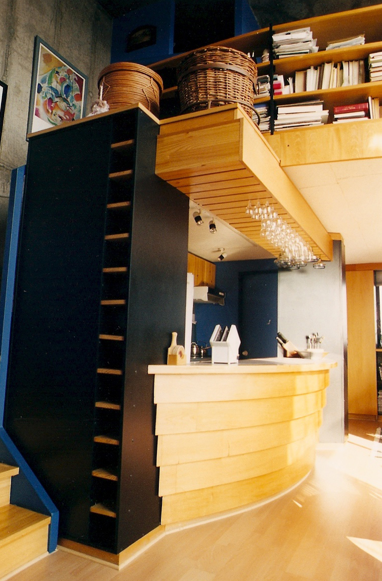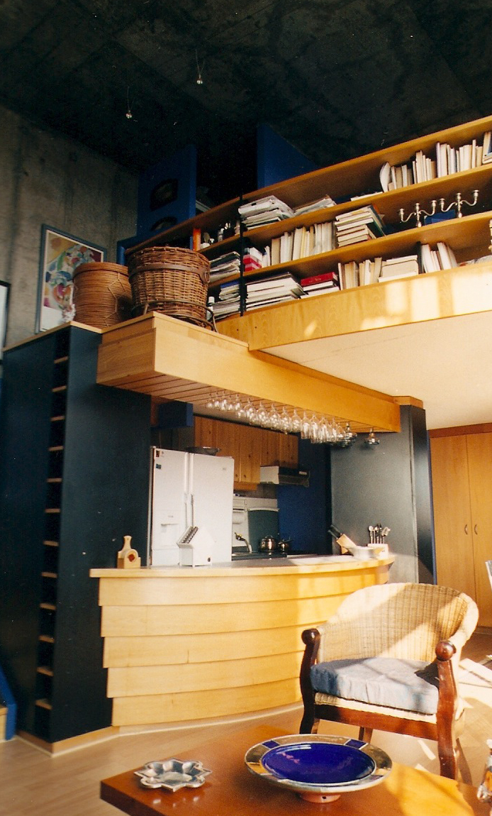 En el 1º piso se propuso un elemento jerárquico y ordenador del espacio que contuviera la kitchenet, definiera el comedor y el estar, conformando y estructurando la escalera, que gira entorno a él y comunica con el 2º piso. Su función es de mesón de servicio y bar, con su correspondiente copero y botellero a la vista.
